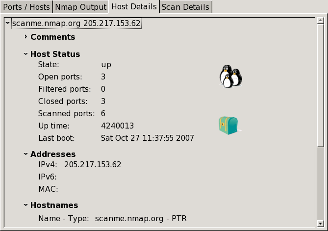 The “Host Details” tab breaks all the information about a single host into a hierarchical display. Shown are the host's names and addresses, its state (up or down), and the number and status of scanned ports. The host's uptime, operating system, OS icon (see Figure 12.5, “OS icons”), and other associated details are shown when available. When no exact OS match is found, the closest matches are displayed. There is also a collapsible text field for storing a comment about the host which will be saved when the scan is saved to a file (see the section called “Saving and Loading Scan Results”).
