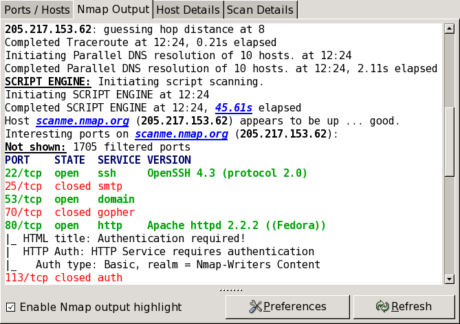 Nmap's output is displayed during and after a scan. This output will be familiar to Nmap users. Except for Zenmap's color highlighting, this doesn't offer any visualization advantages over running Nmap in a terminal. However, other parts of Zenmap's interface interpret and aggregate the terminal output in a way that makes scan results easier to understand and use.