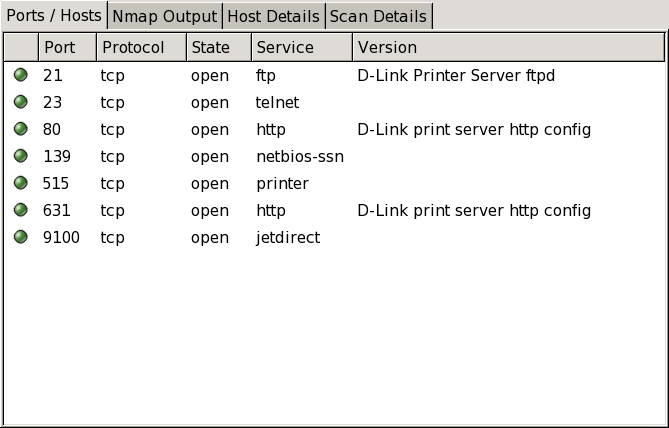 Each scan window contains five tabs which each display different aspects of the scan results. They are: “Nmap Output”, “Ports / Hosts”, “Topology”, “Host Details”, and “Scans”. Each of these are discussed in this section.