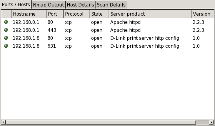 The “Ports / Hosts” tab's display differs depending on whether a host or a service is currently selected. When a host is selected, it shows all the interesting ports on that host, along with version information when available. Host selection is further described in the section called “Sorting by Host”.